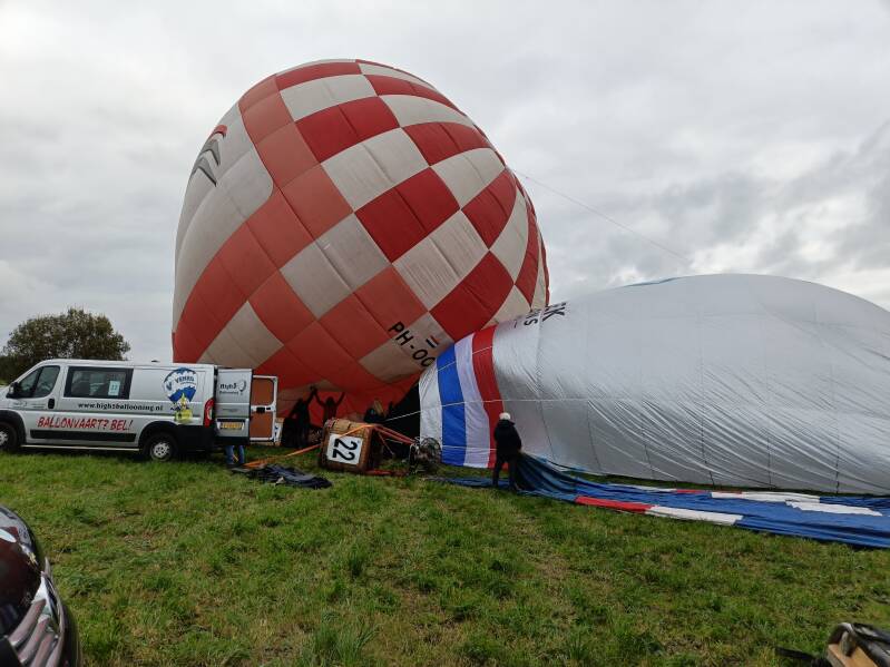 Onze landing is net voorbij het laatste doel in een tuintje van een mevrouw. Krap veldje, maar we kunnen de ballon erin krijgen.
